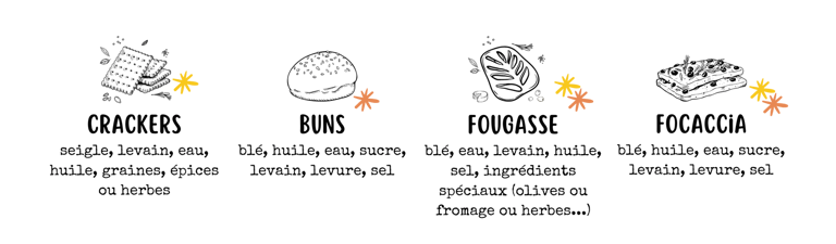 En plus du pain, retrouvez chaque semaine des crackers. Ponctuellement, nous proposerons également des fougasses, focaccia ou des buns.